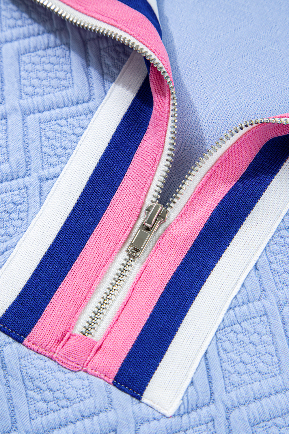 Beau Blue Contrast Striped Trim Zipped Stand Collar Textured Puff Sleeve Plus Size T Shirt Dress