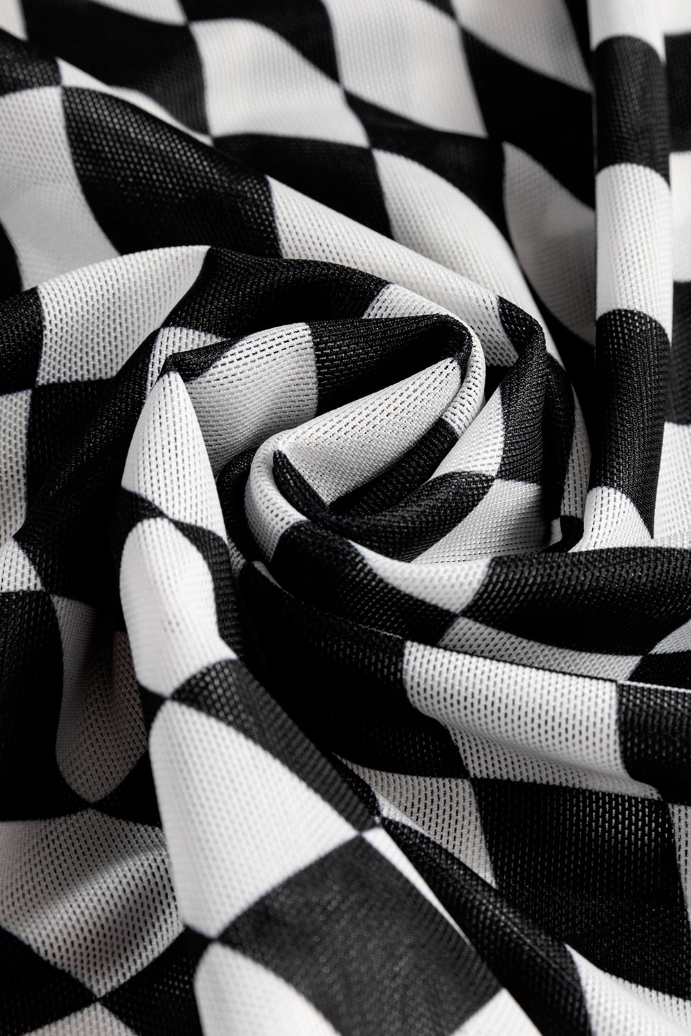 Black Checkered Pattern Mesh Mock Neck Long Sleeve Top