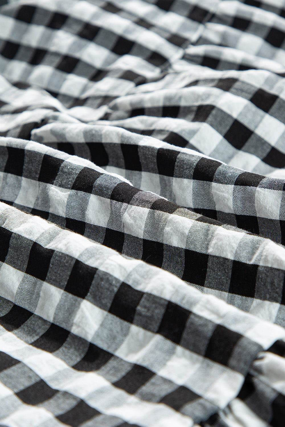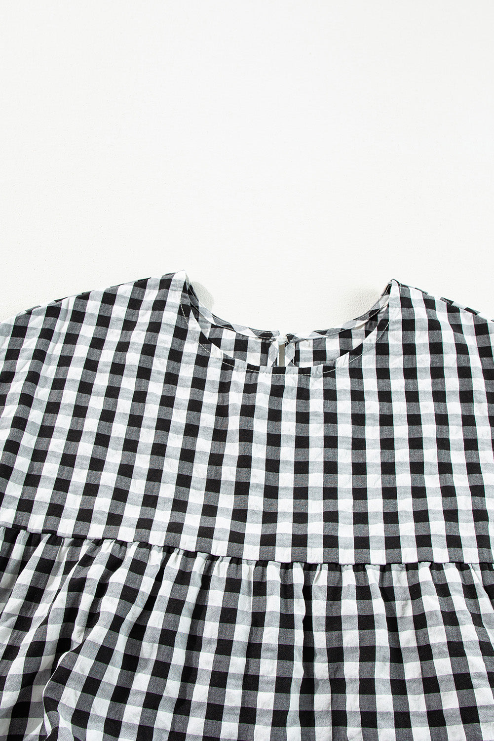 Black Checkered Puff Sleeve Tiered Loose Babydoll Blouse