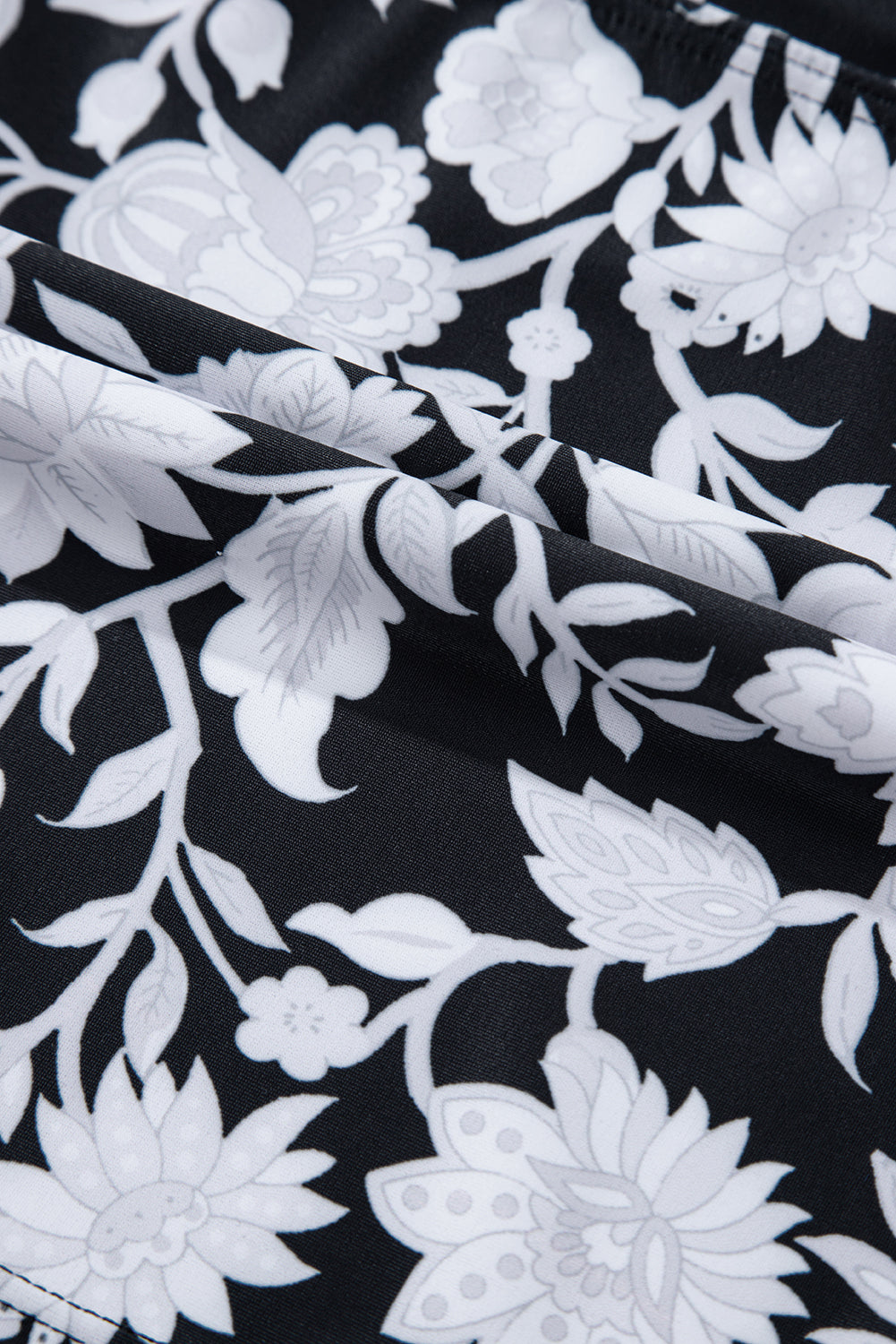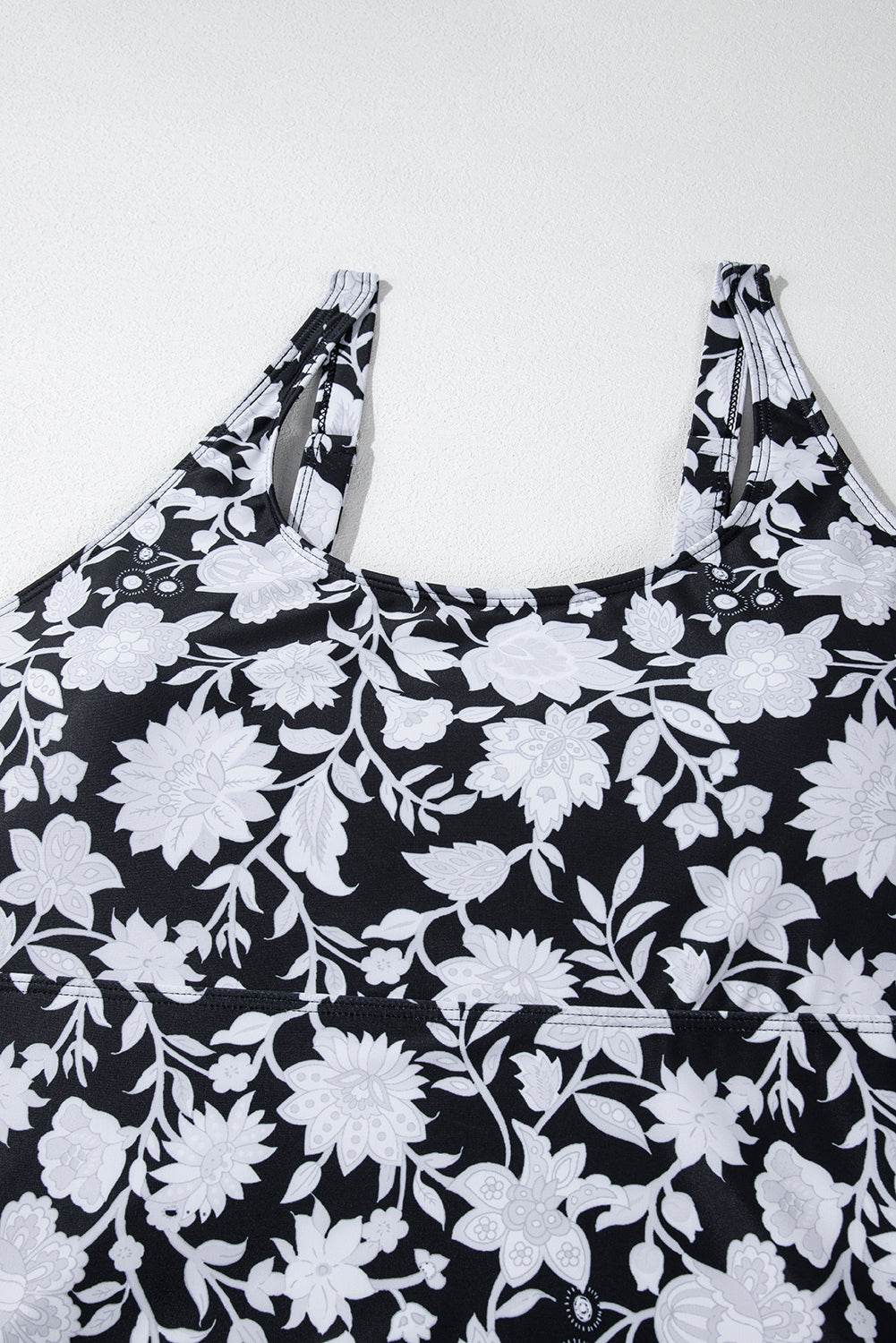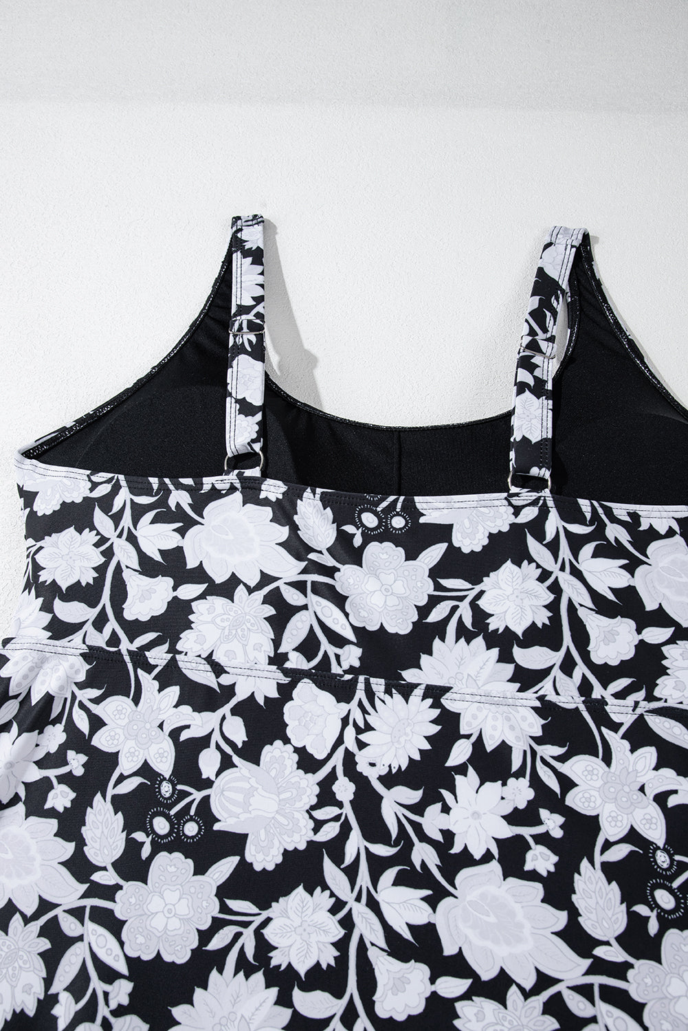 Black Plus Size Printed Square Neck Drawstring Ruffled Tankini Set