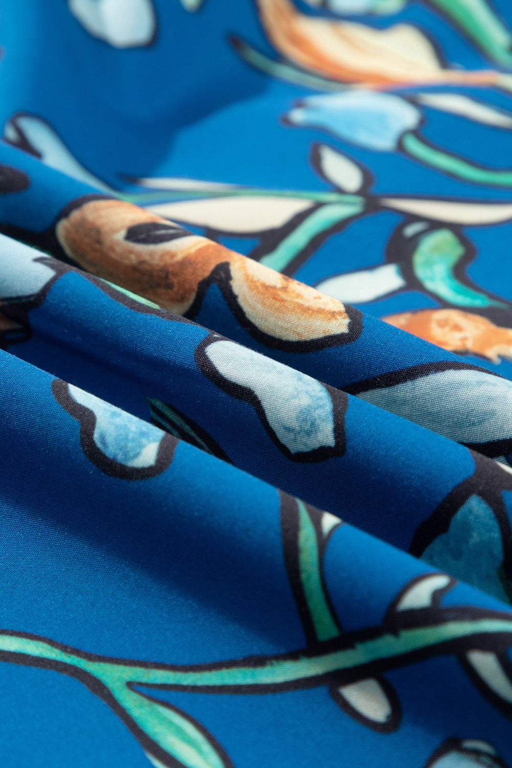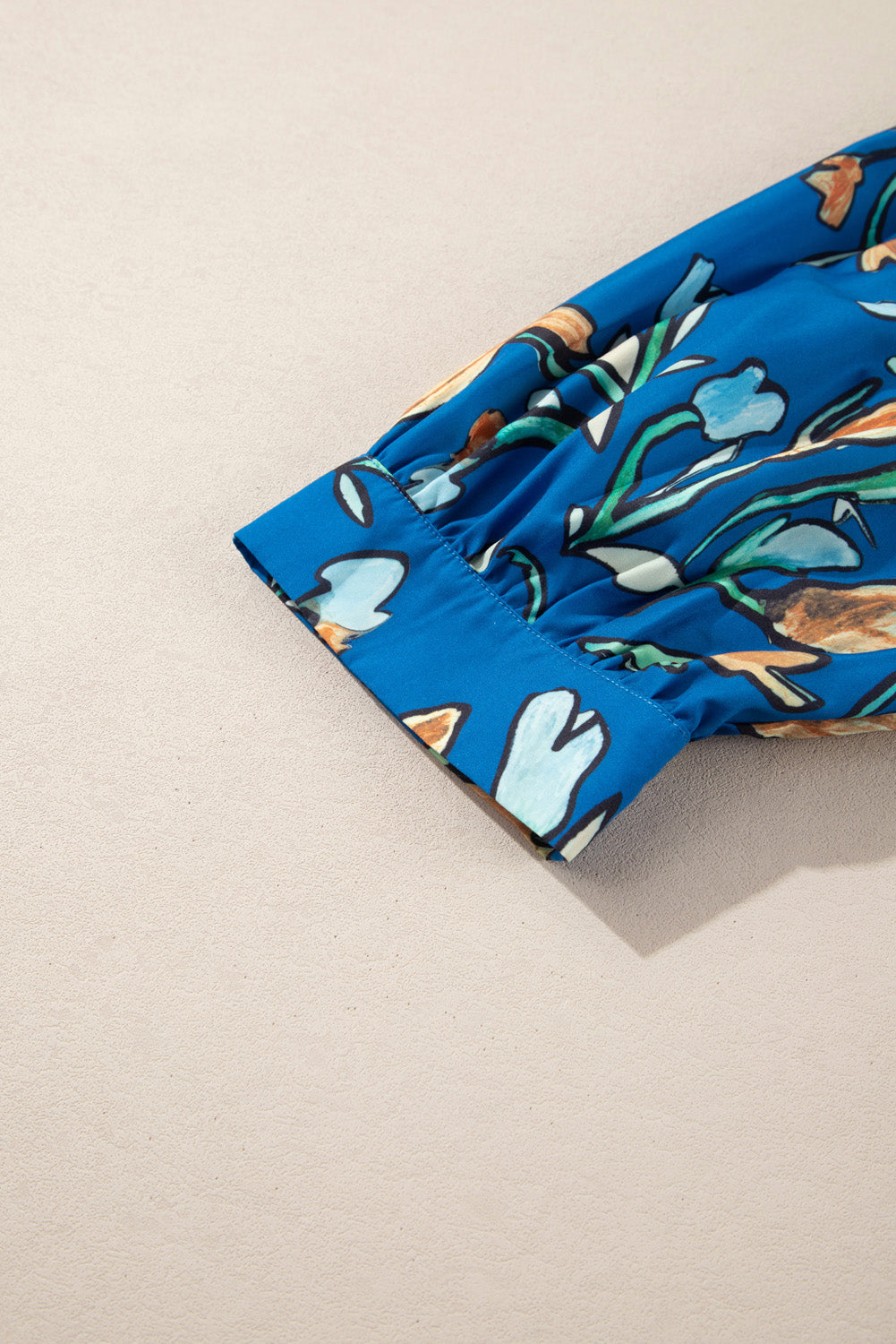 Blue Floral Notched V Neck Half Sleeve Plus Size Blouse