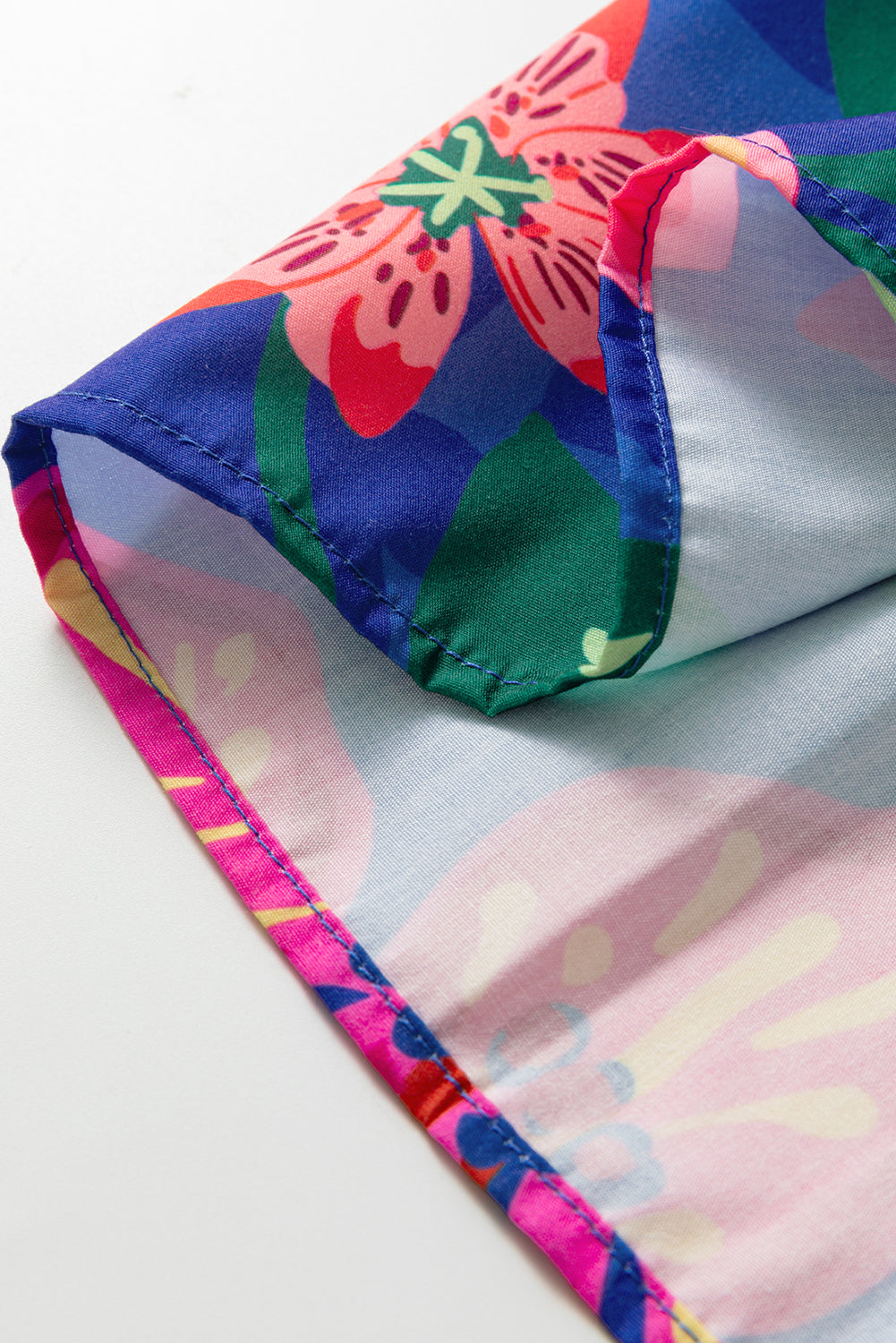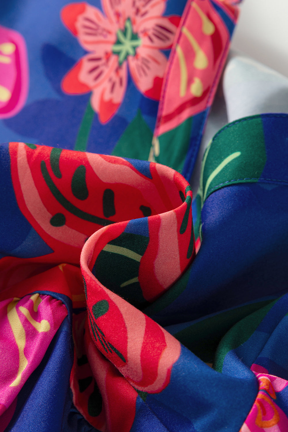 Blue Floral Print 3/4 Sleeve V Neck Tiered Long Dress