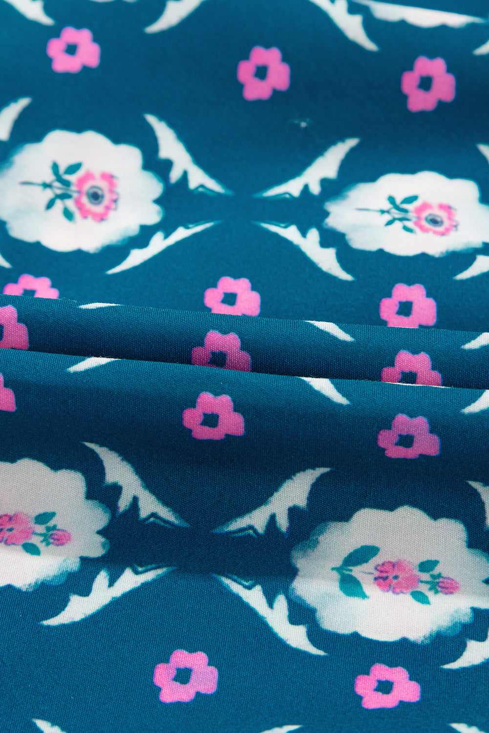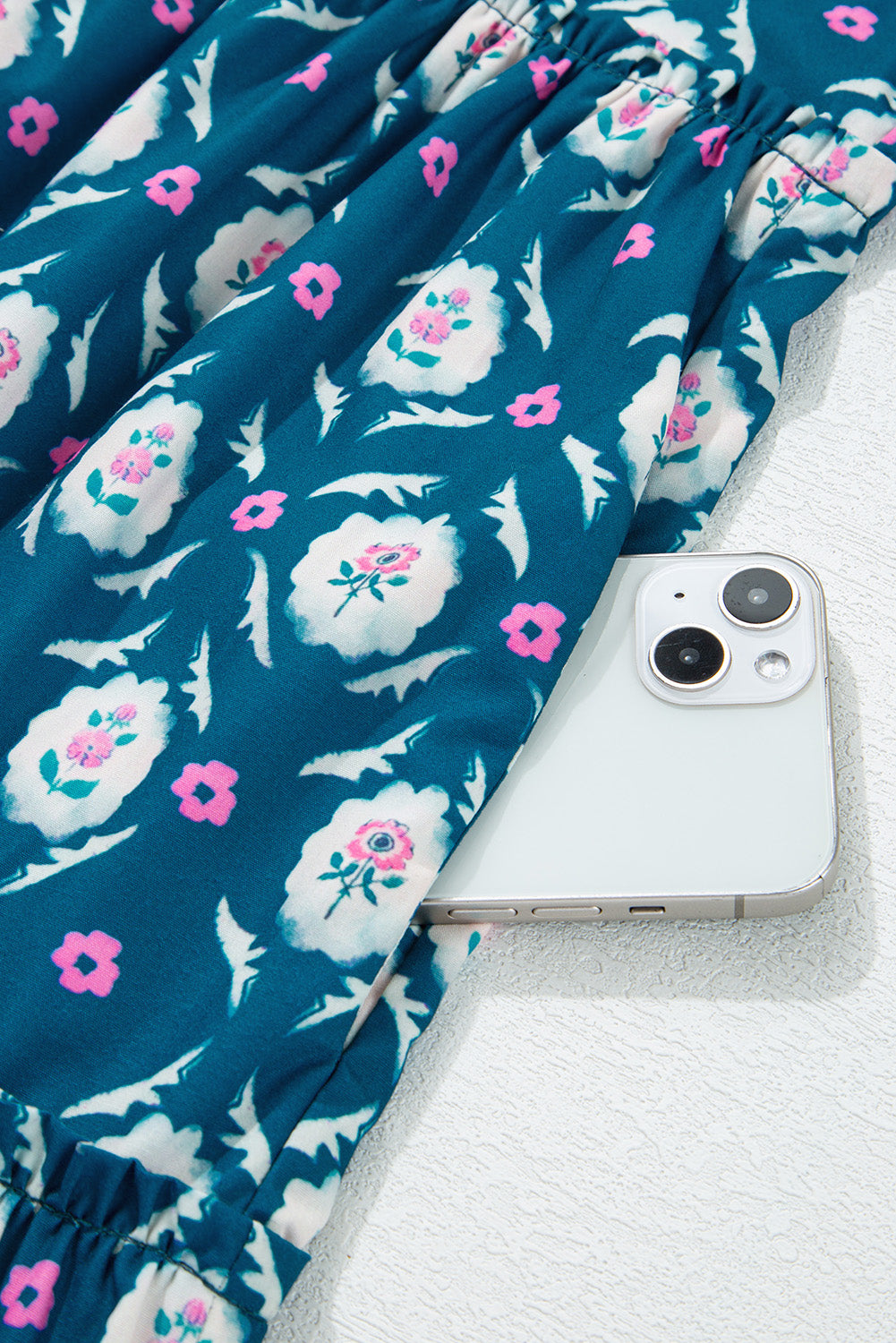 Blue Retro Floral Print Split Neck Ruffle Short Sleeve Dress