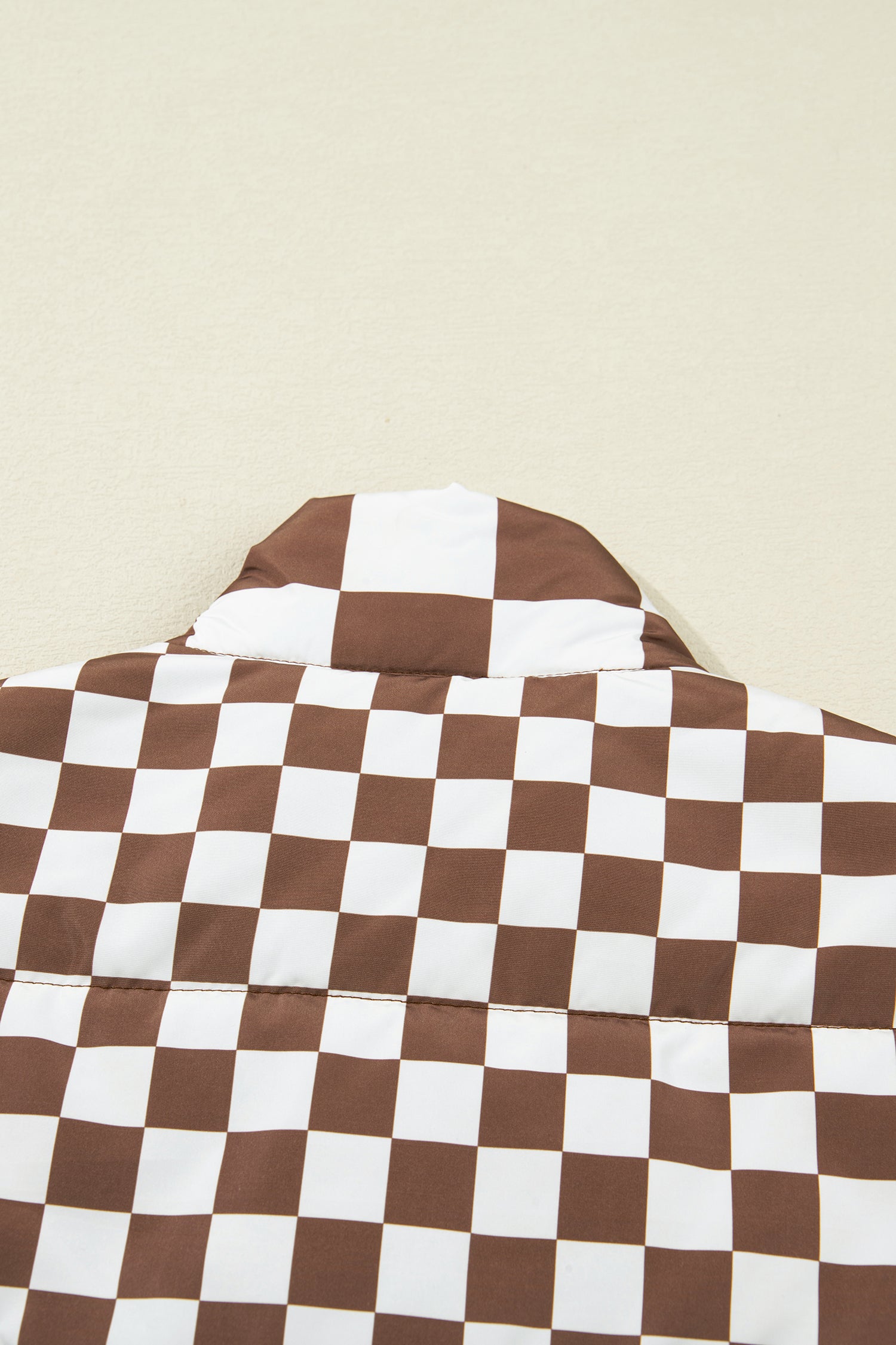 Brown Double Checked Stand Collar Cropped Puffer Vest