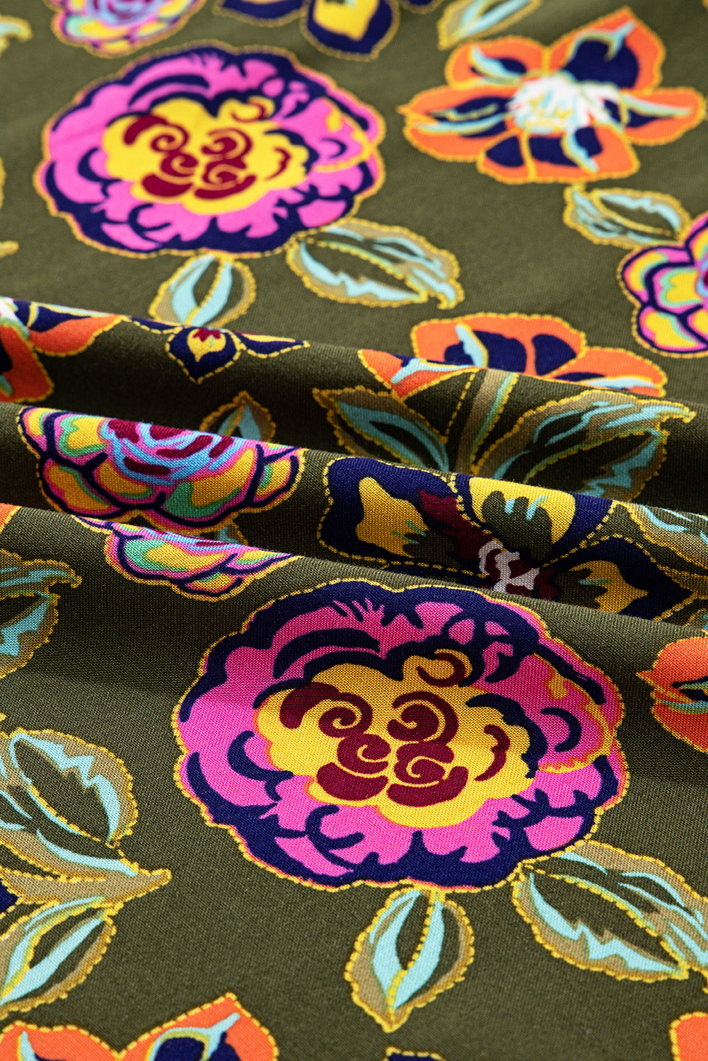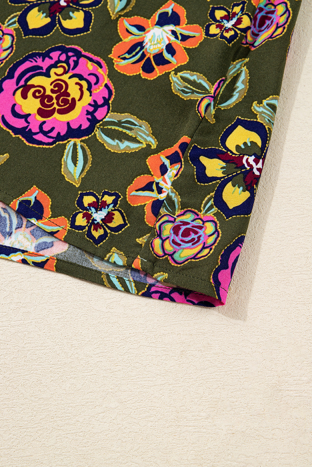 Green Floral Print Split Neck Bubble Sleeve Shift Mini Dress