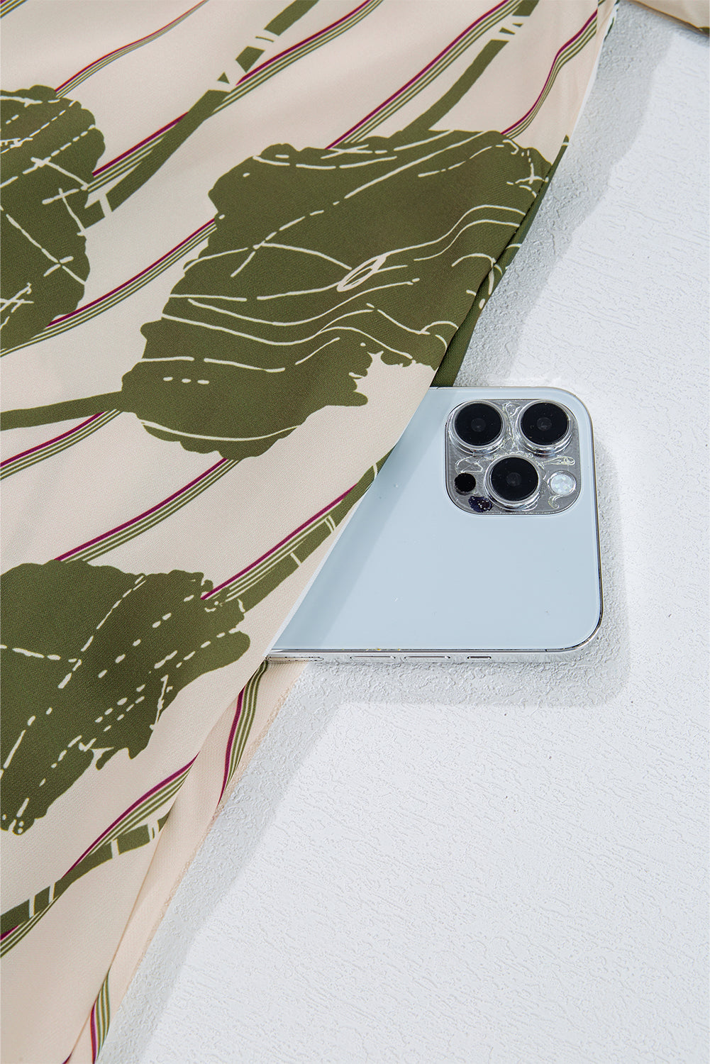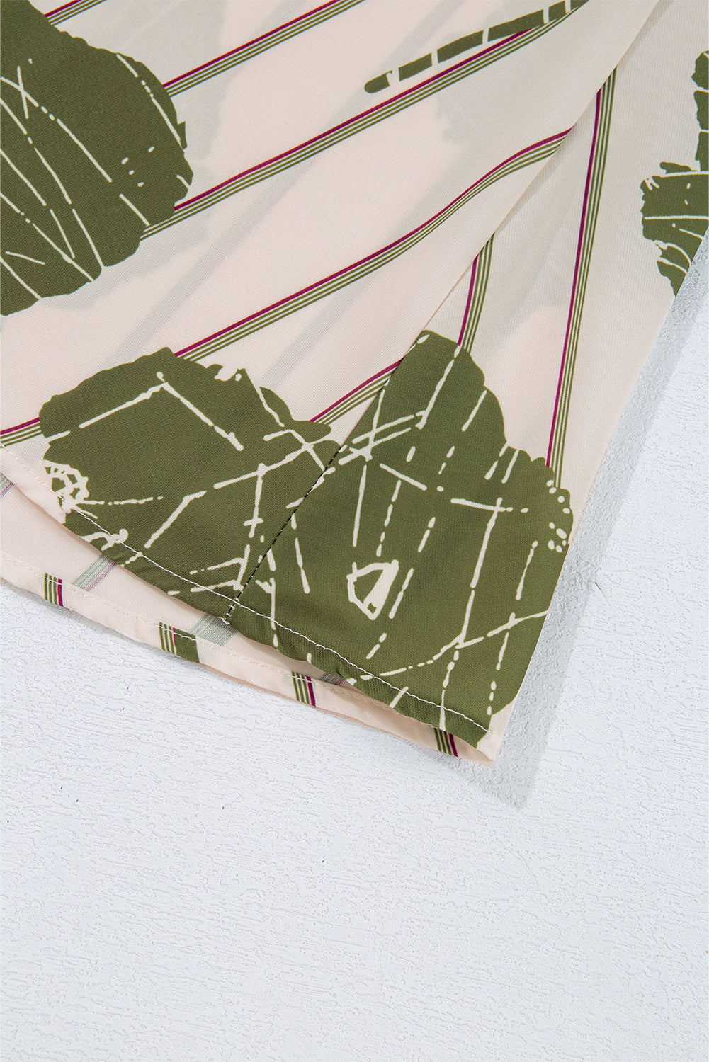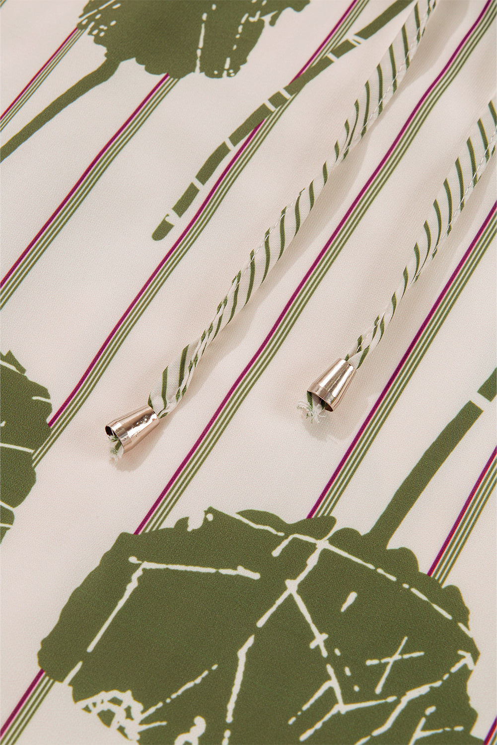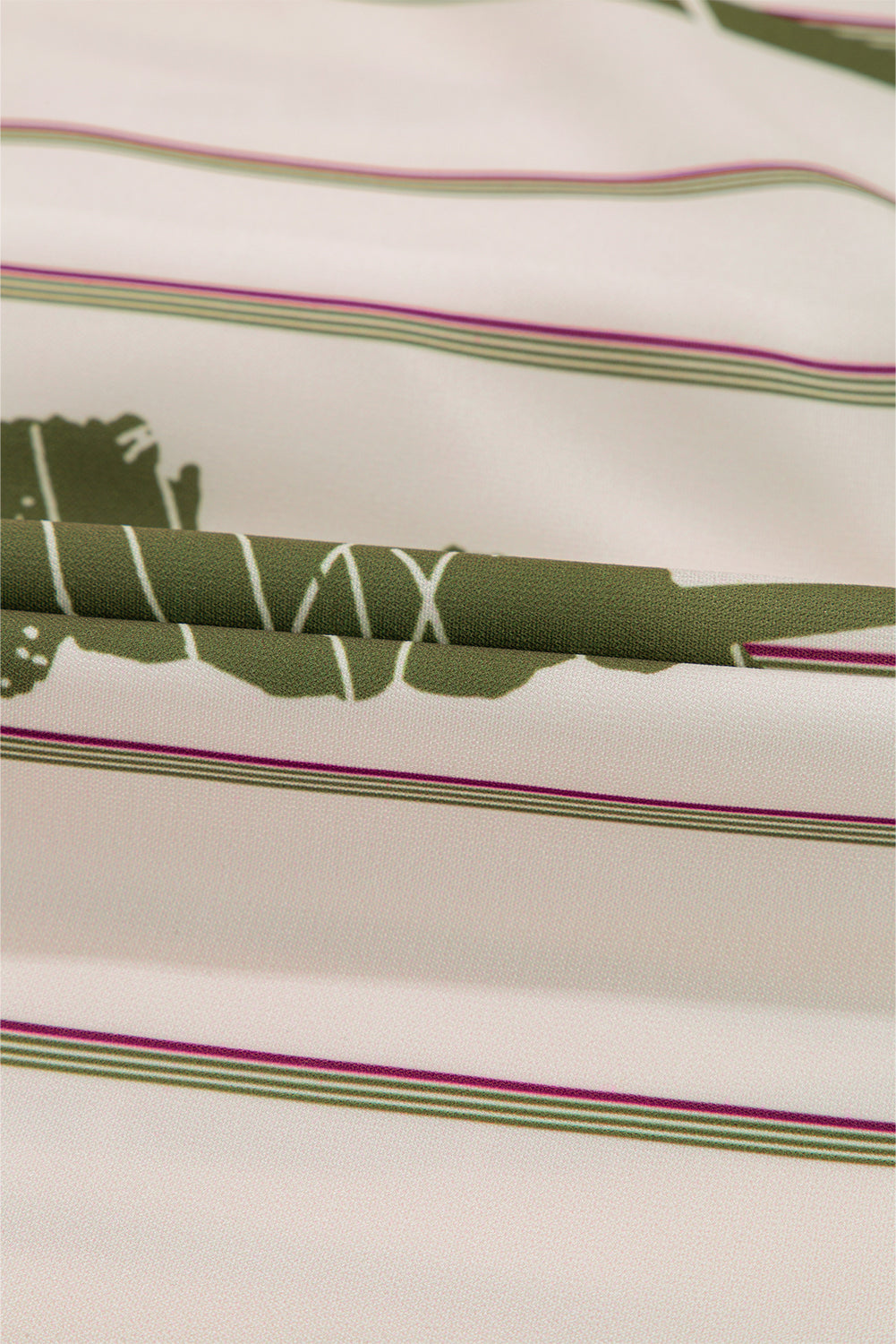 - Features a vibrant green floral print and striped background.