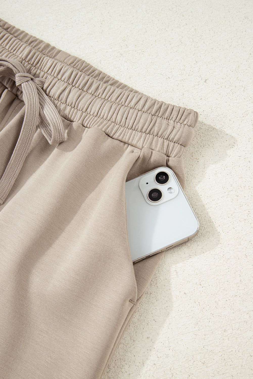Matching a pair of loose drawstring pants designed with pockets.