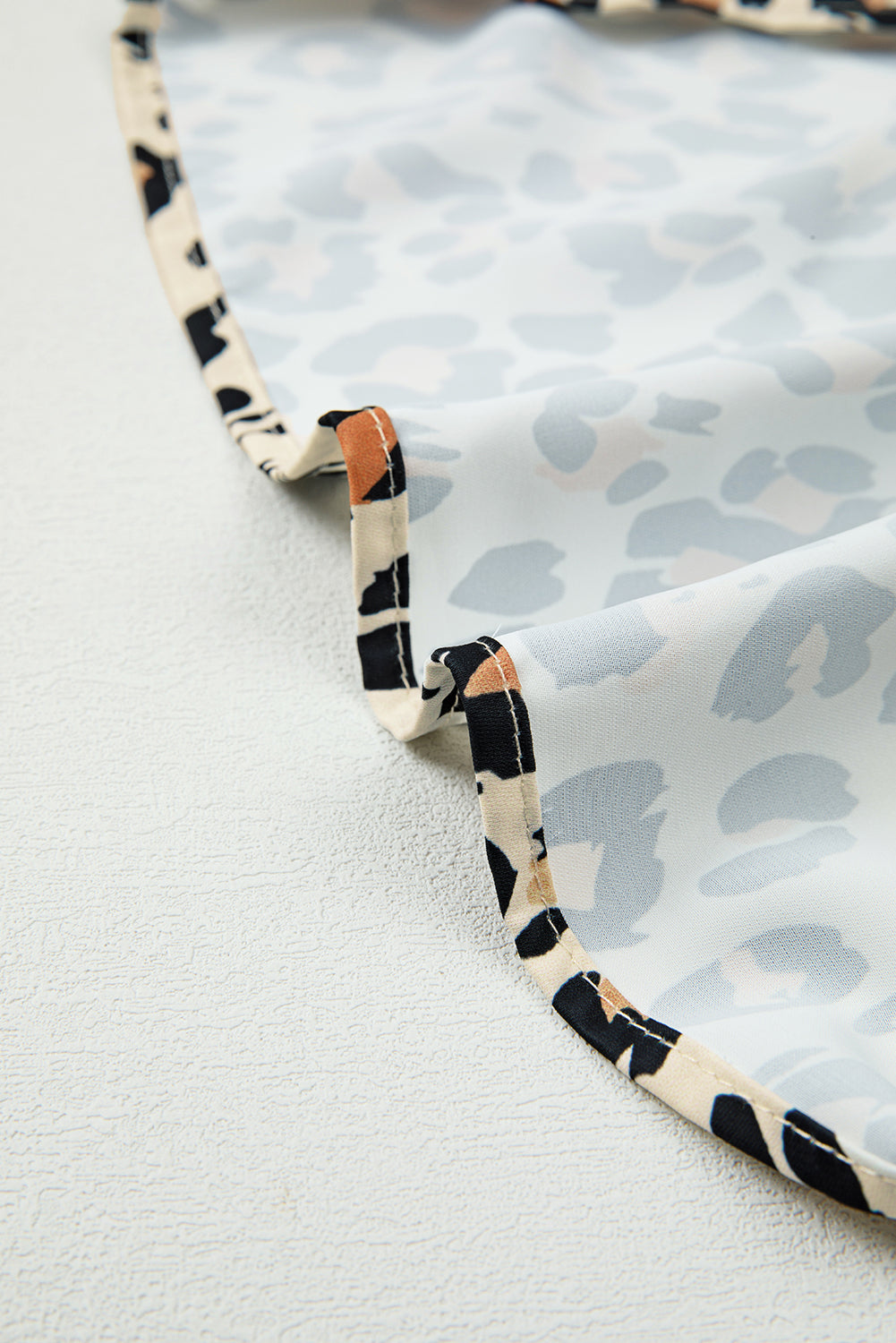 Khaki Leopard Color Block Contrast Striped V Neck Half Sleeve Loose Fit Blouse