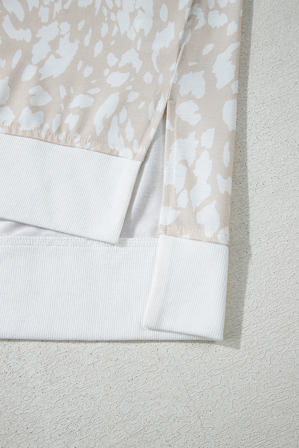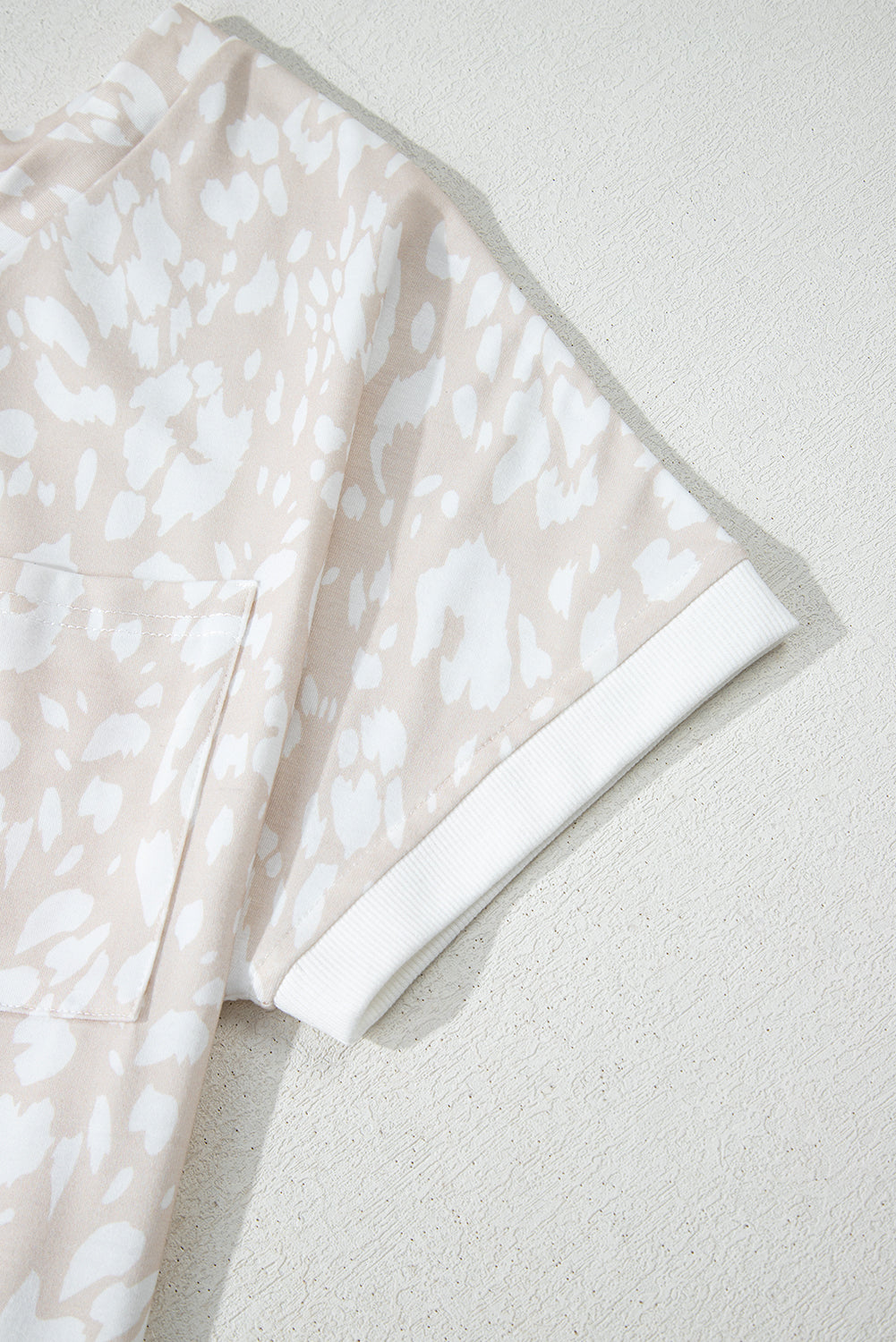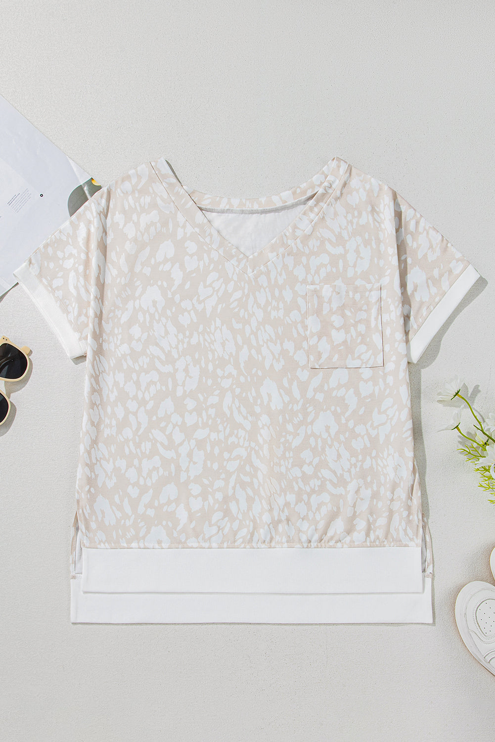 - This chic tee features a bold leopard print with a V-neckline and side slits.