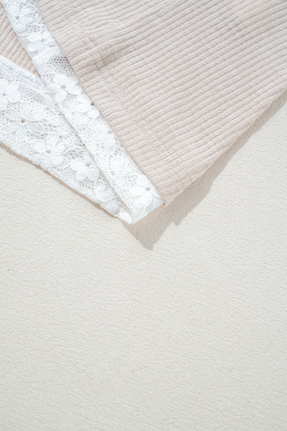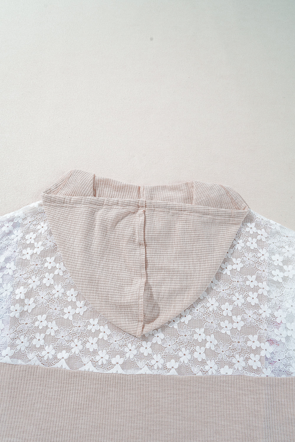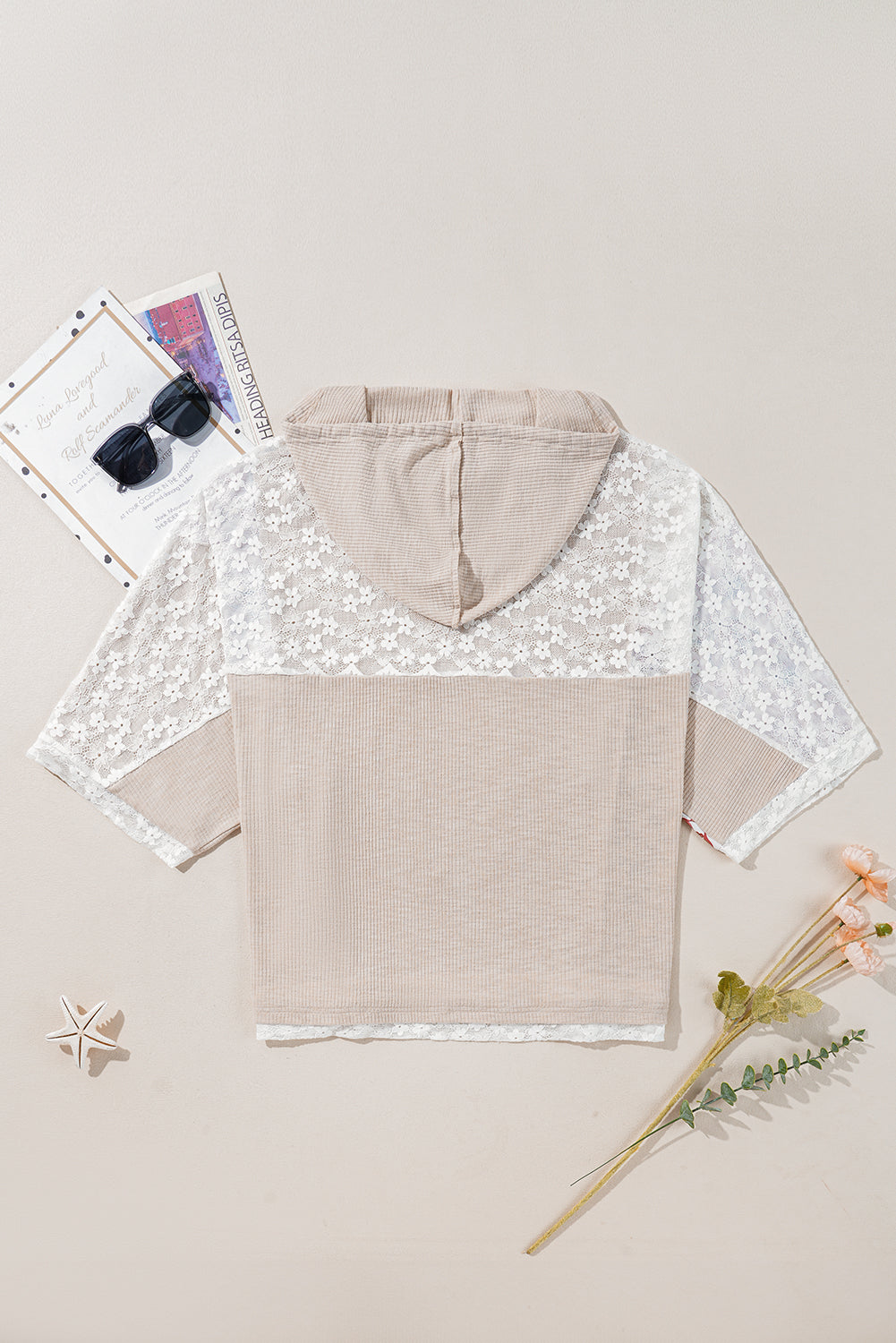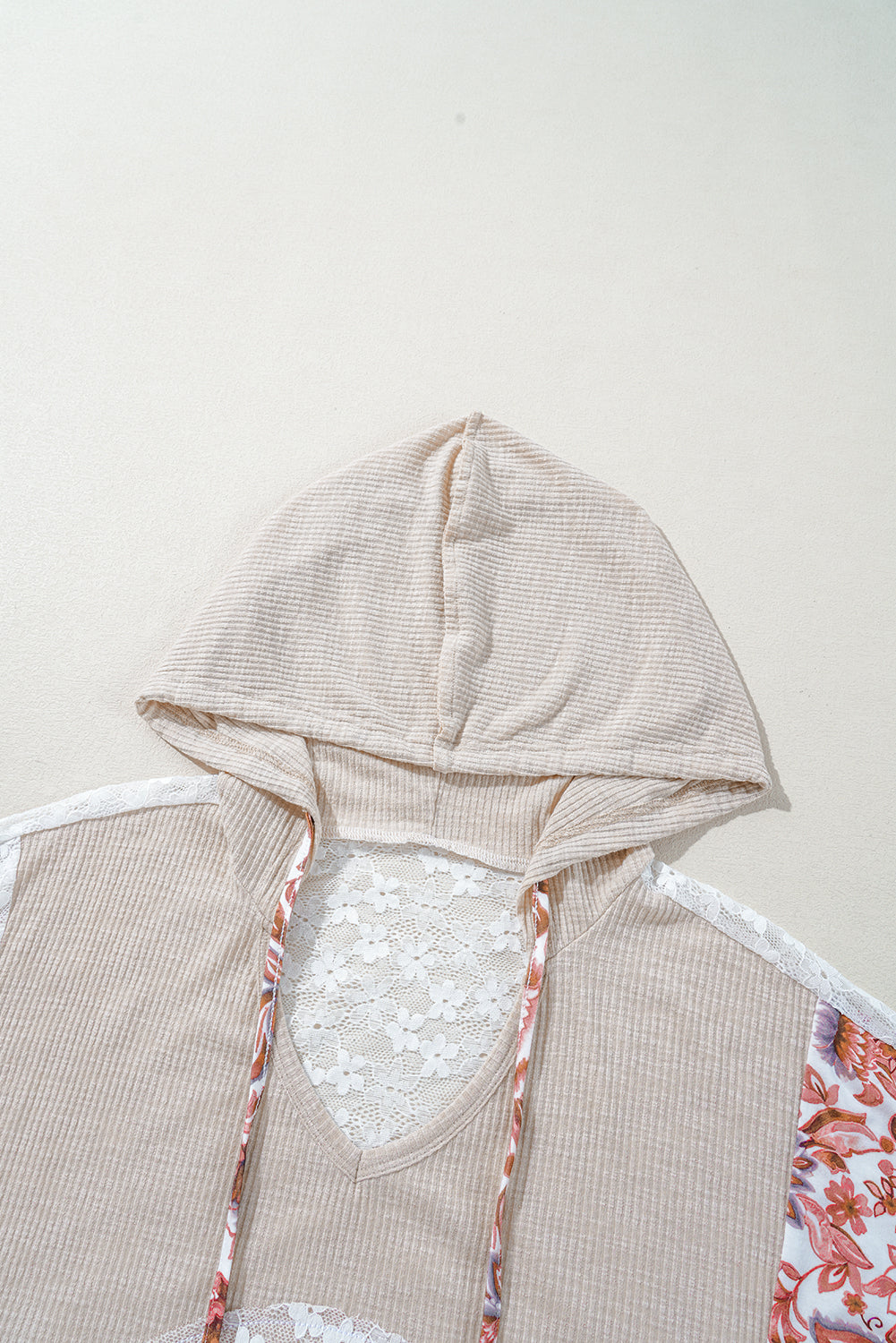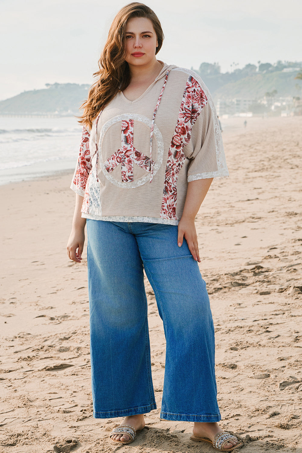 Khaki V Neck Floral Peace Sign Graphic Lace Patch Ribbed Plus Size Hooded Top