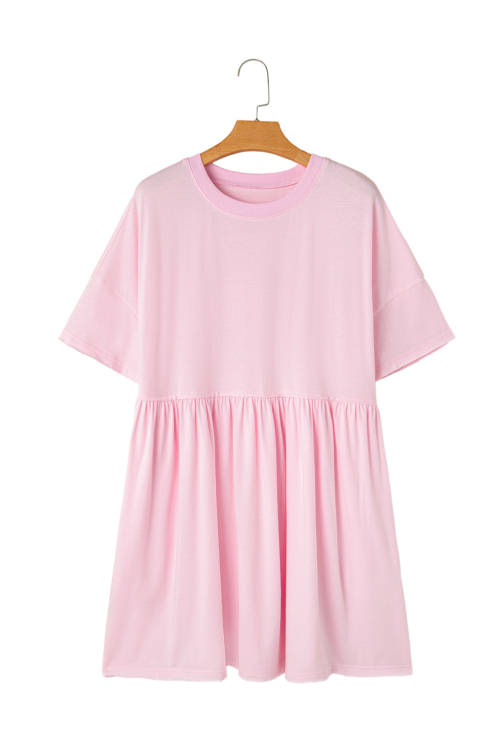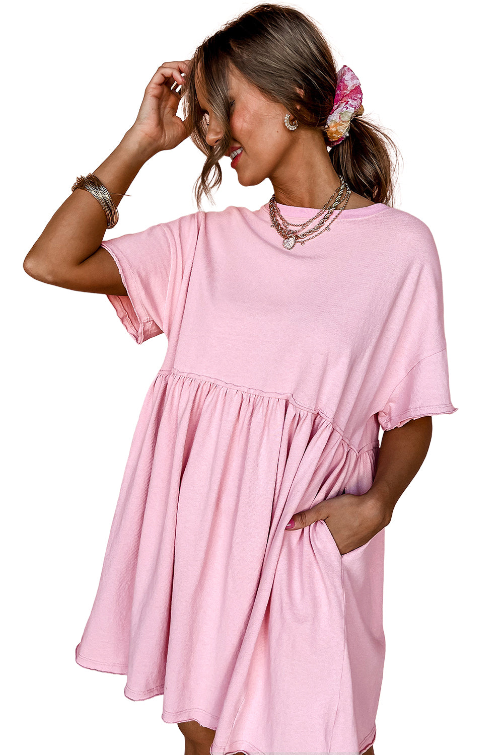 Light Pink Solid Color Pocketed Raw Edge Babydoll Dress