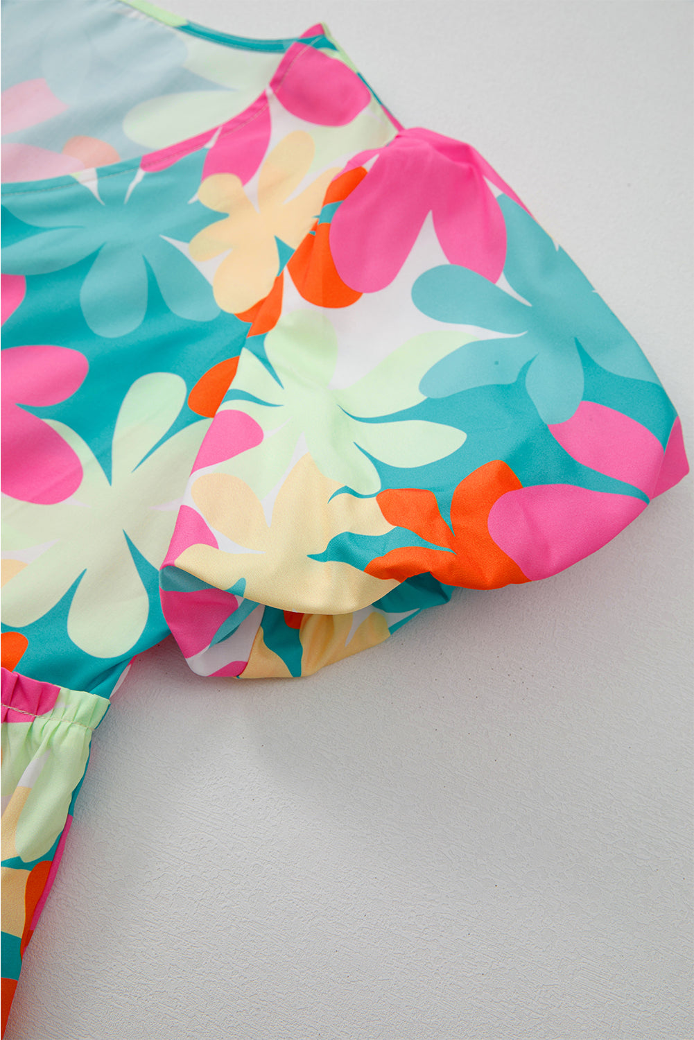 Pink Floral Print Bubble Sleeve V Neck Peplum Blouse