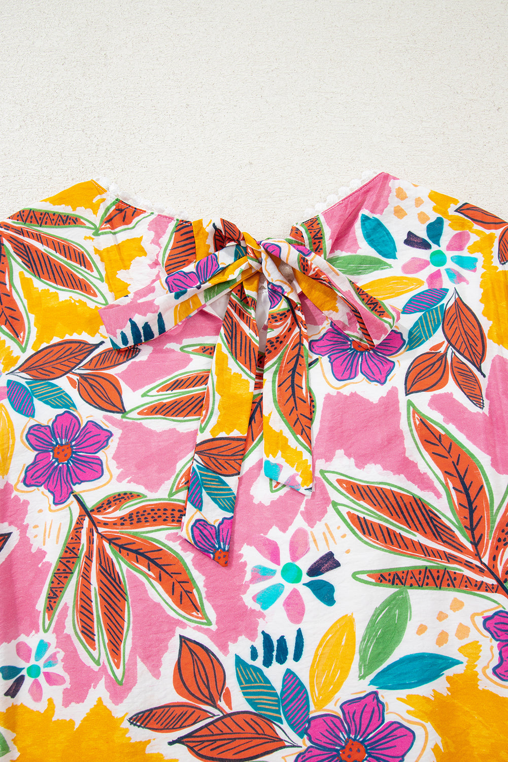 Pink Floral Print Lace Trimmed Tie Back Bell Sleeve Swing Mini Dress