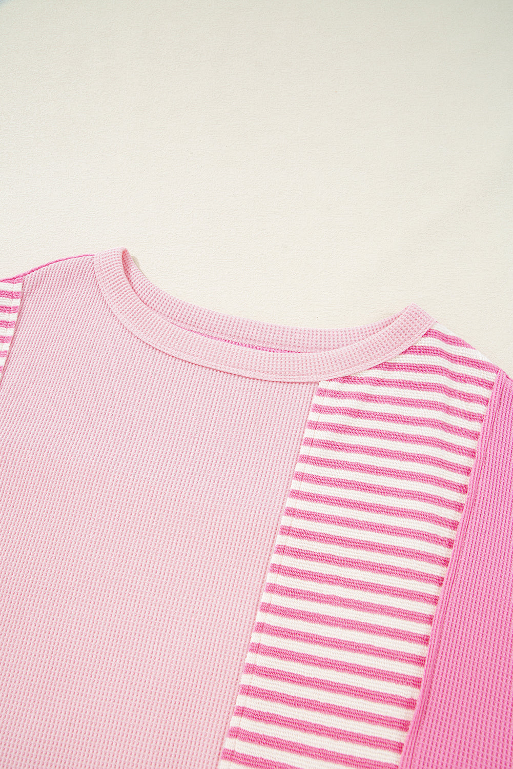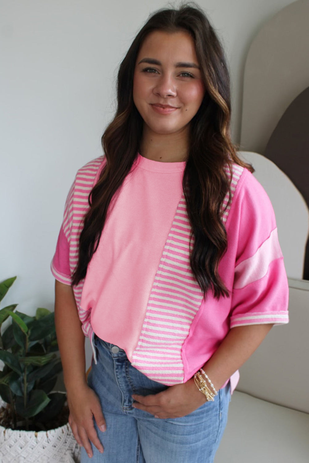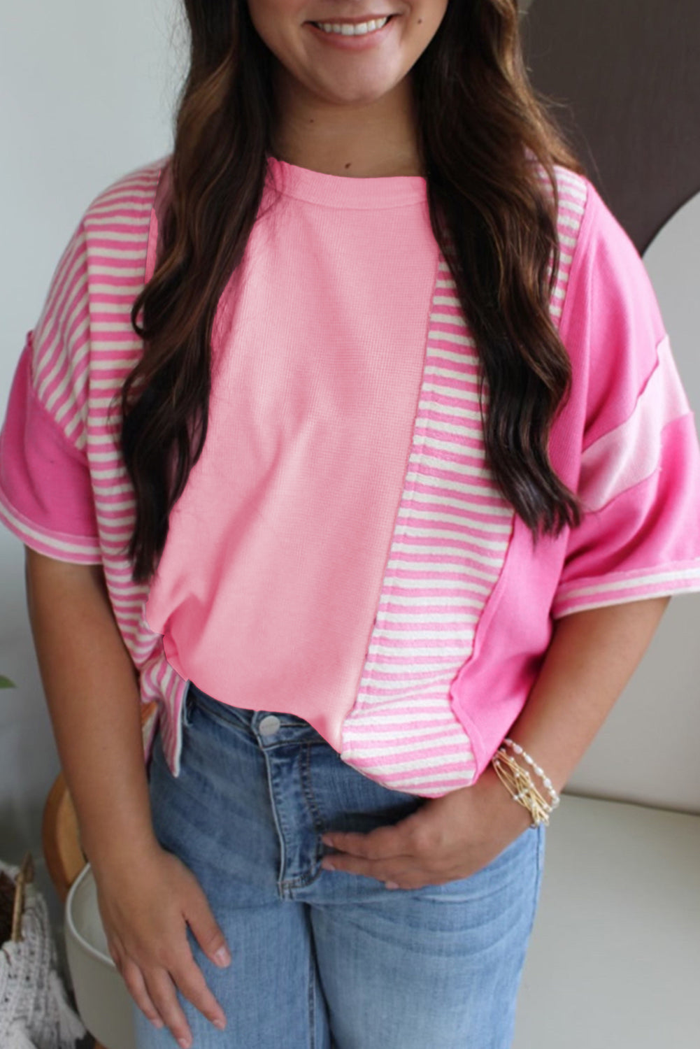 Pink Stripe Color Block Patchwork Loose Half Sleeve T Shirt