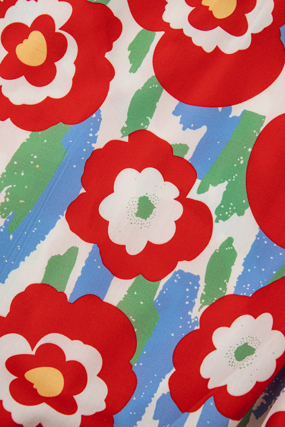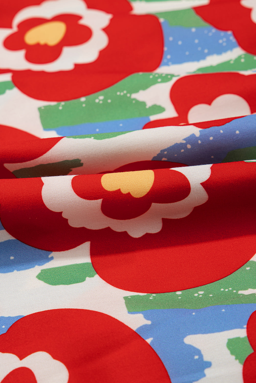 Red Plus Size Floral Print Ruffle Trim Split Neck Peplum Top