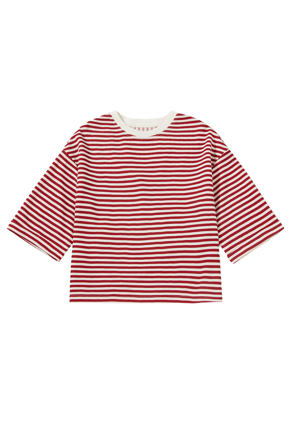 Red Stripe Bowknot Cutout Back Drop Shoulder Wide Bracelet Sleeve Loose Tee