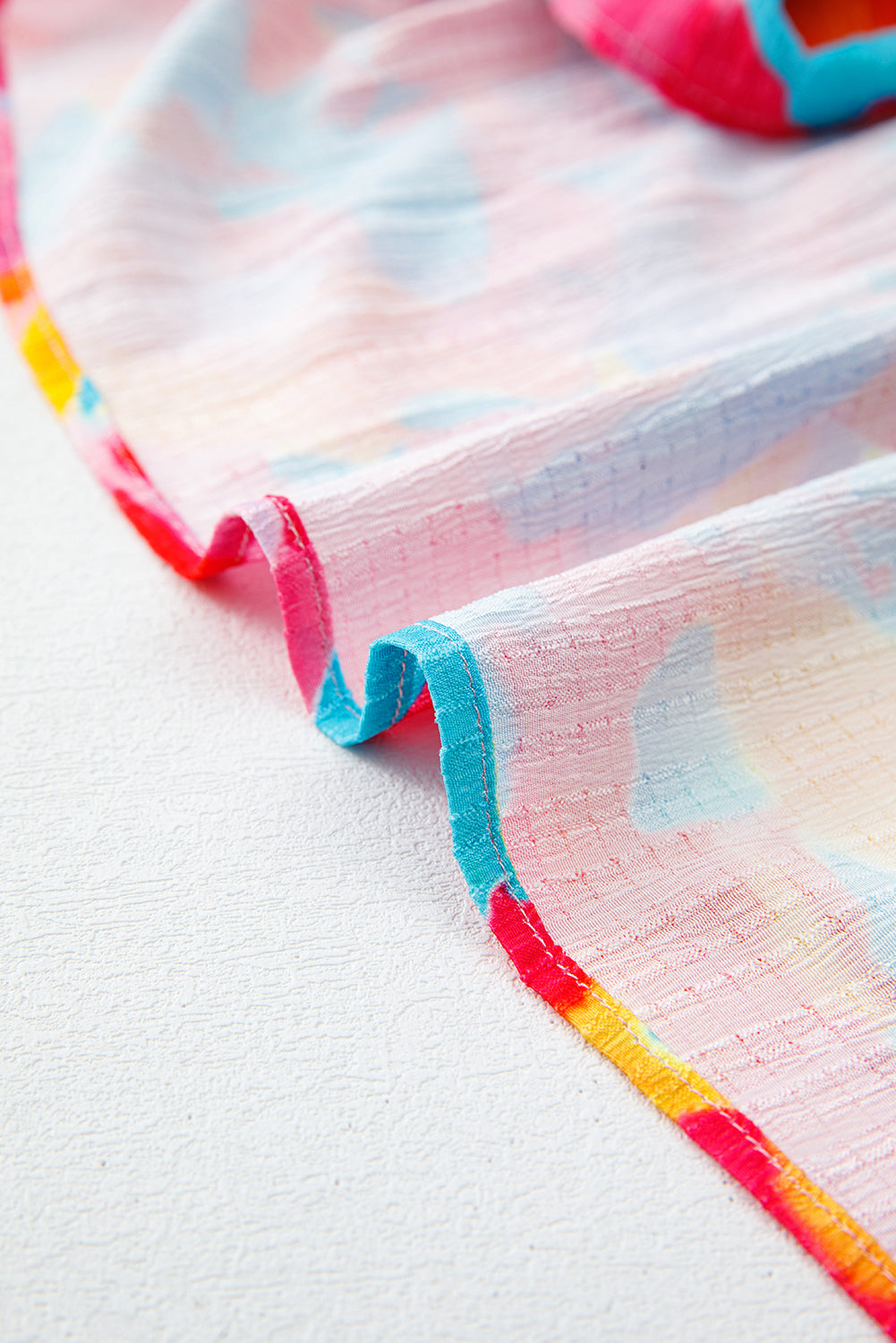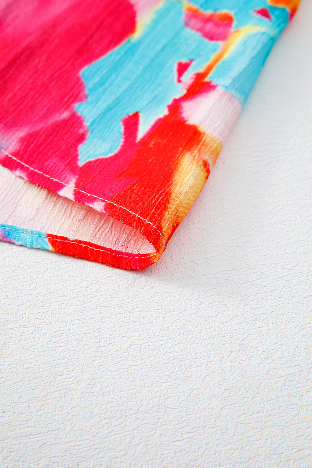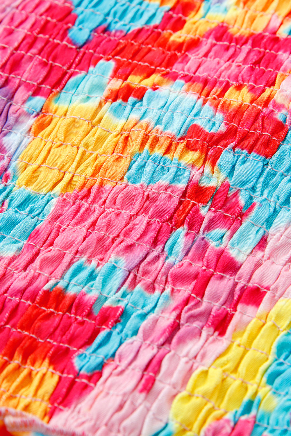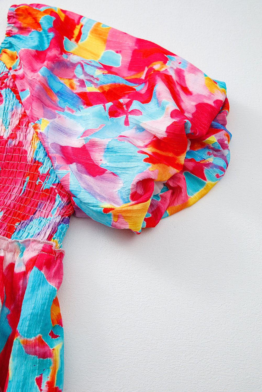 Rose Abstract Printed Puff Sleeve Square Neck Smocked Bust Tied Back Plus Size Dress