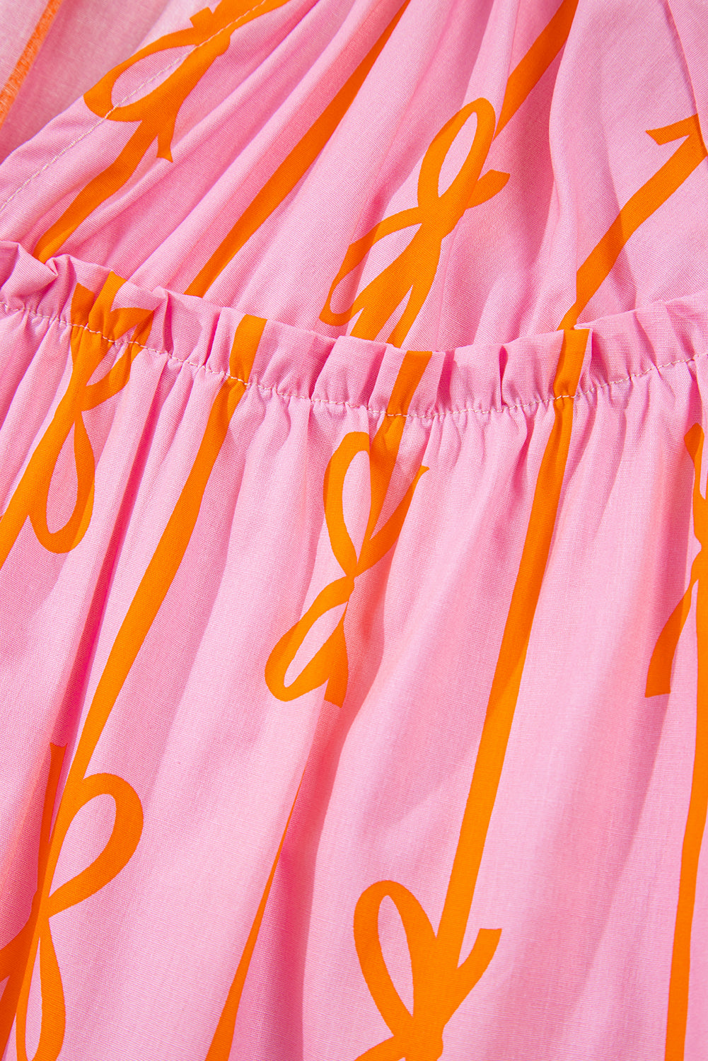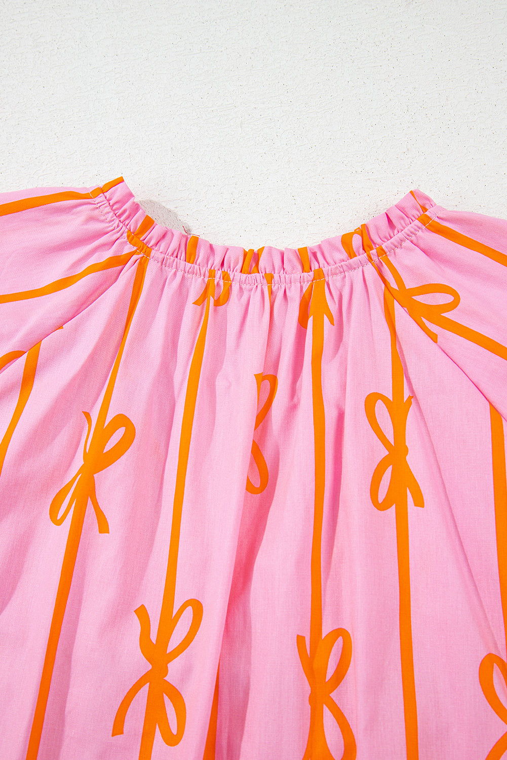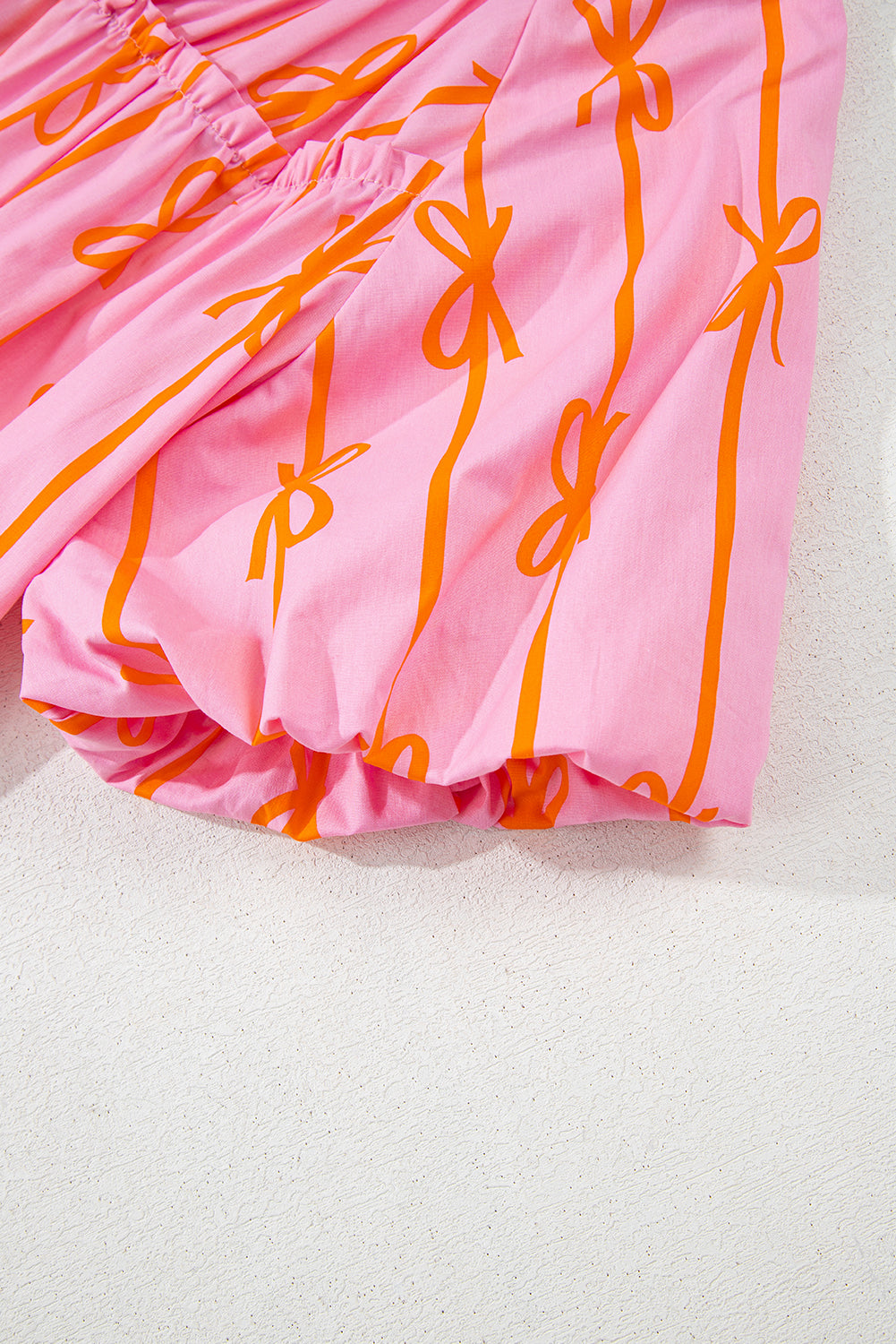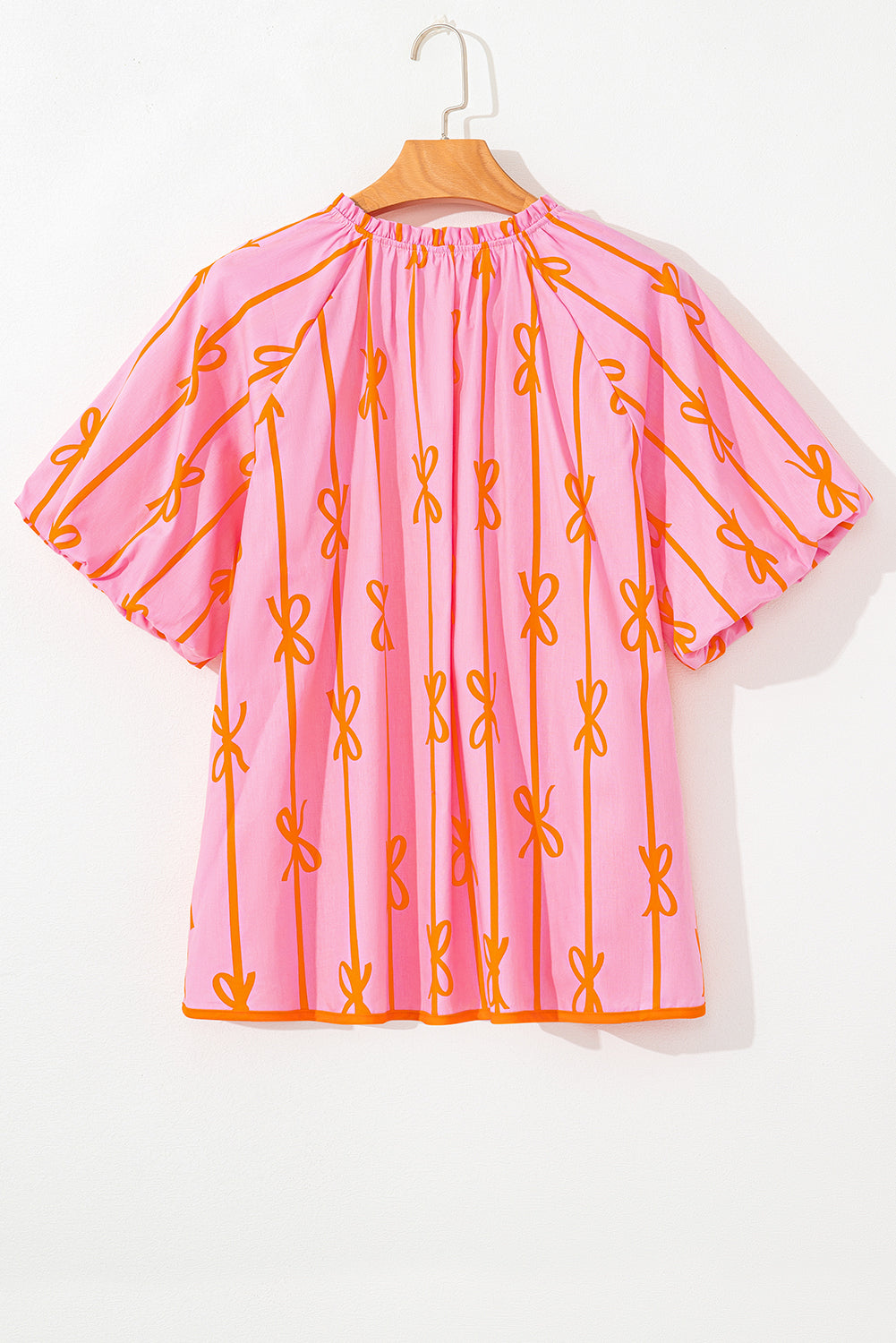 Rose Bowknot Print Shirred V Neck Puff Sleeve Plus Size Blouse