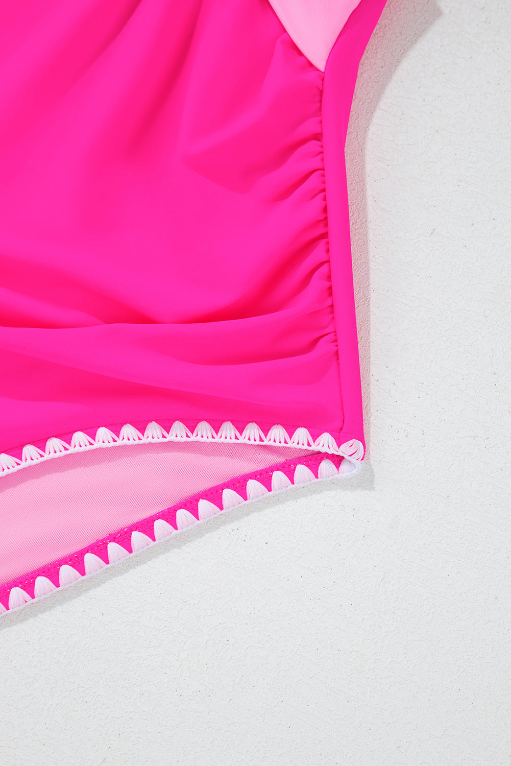Rose Red Ric Rac Trim Contrasted Patchwork Cutout One Piece Swimsuit