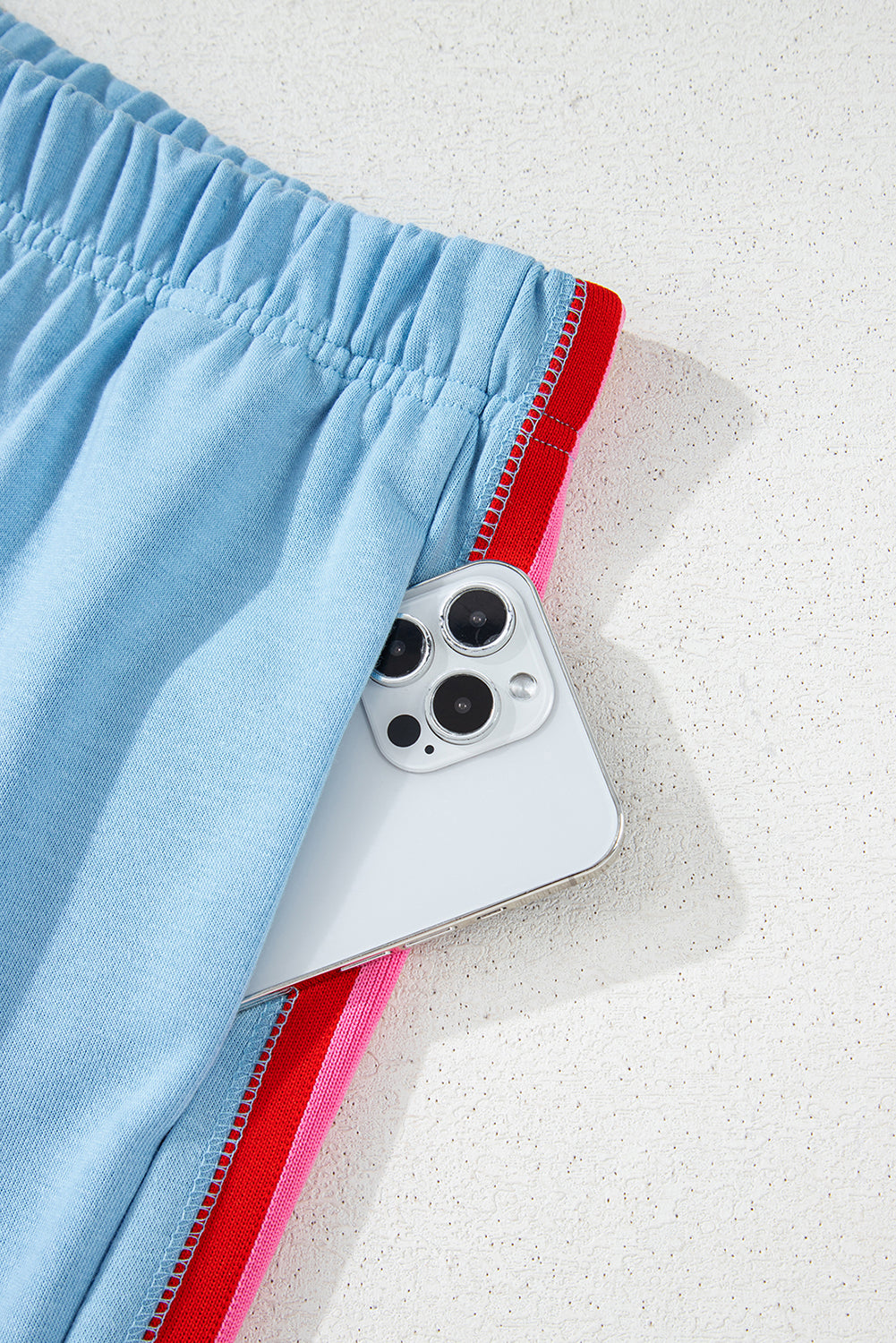 Sky Blue Rainbow Colorblock Collared Short Sleeve Top 2 Piece Shorts Set