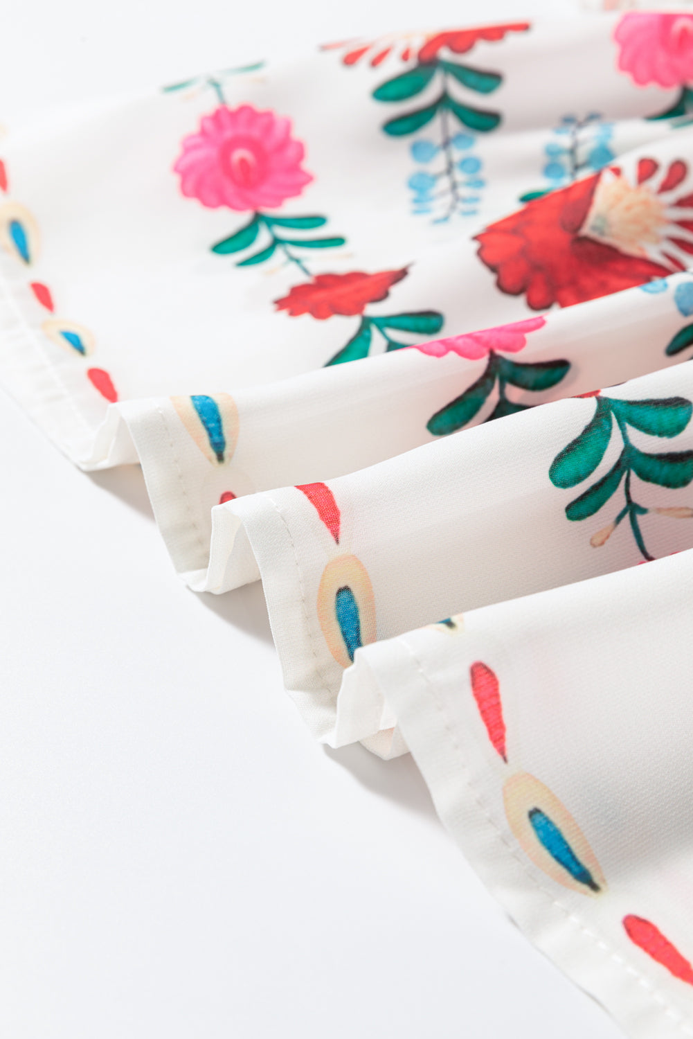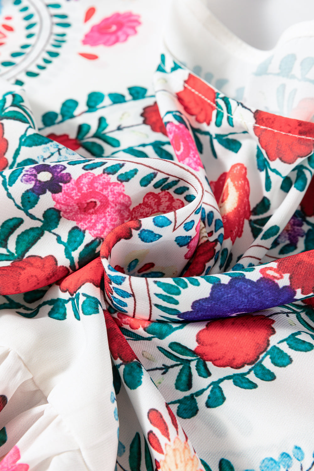 White Boho Floral Print Round Neck Ruffle Trim Blouse