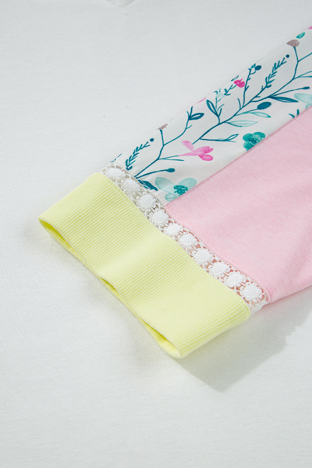 - This casual long sleeve top features a unique floral colorblock patchwork design.