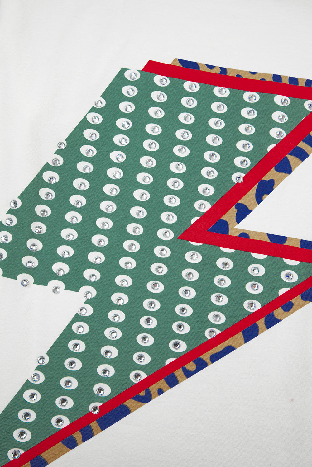 - The bolt tee features rhinestone detailing and paint splatter blot graphic.
